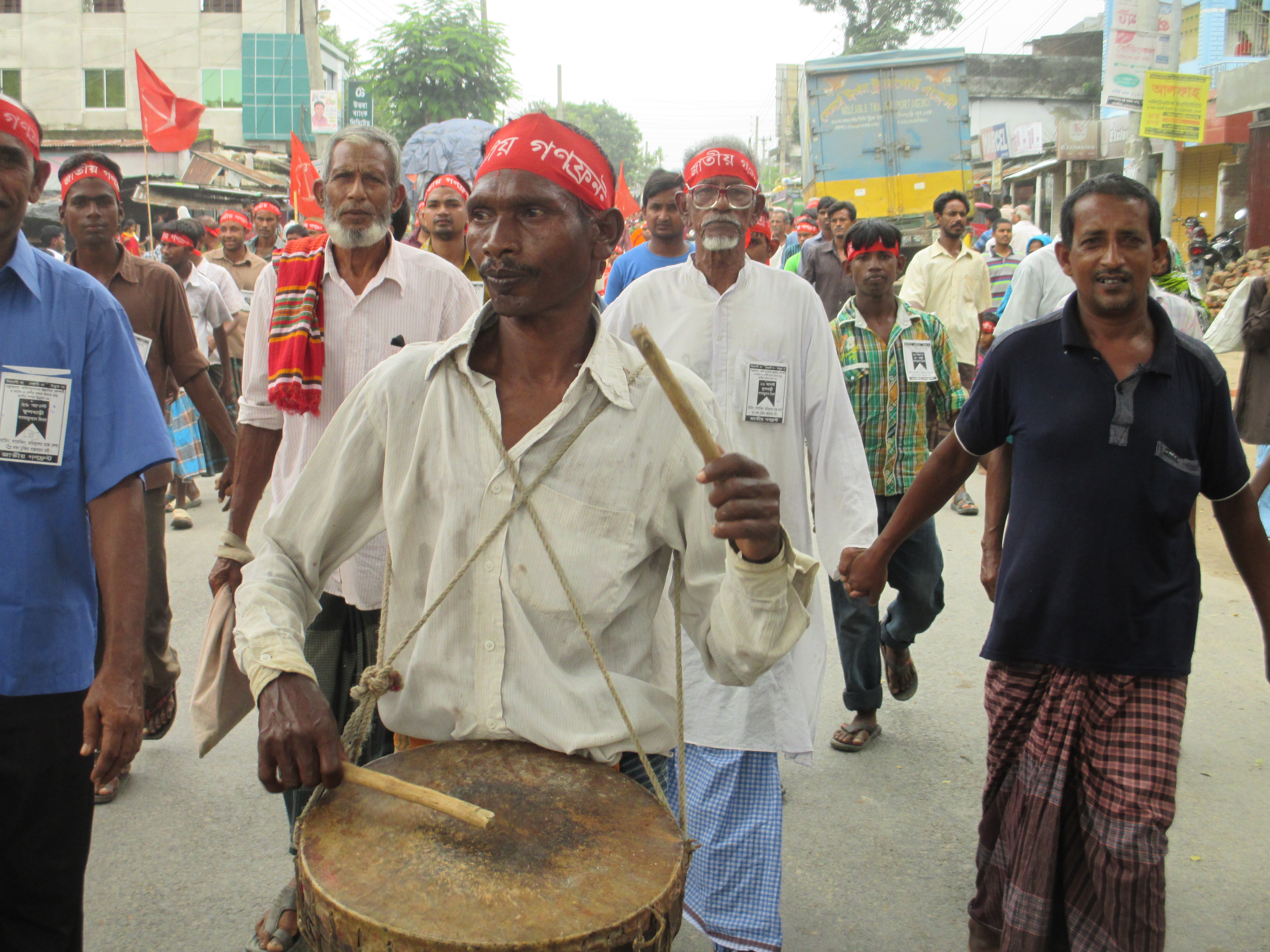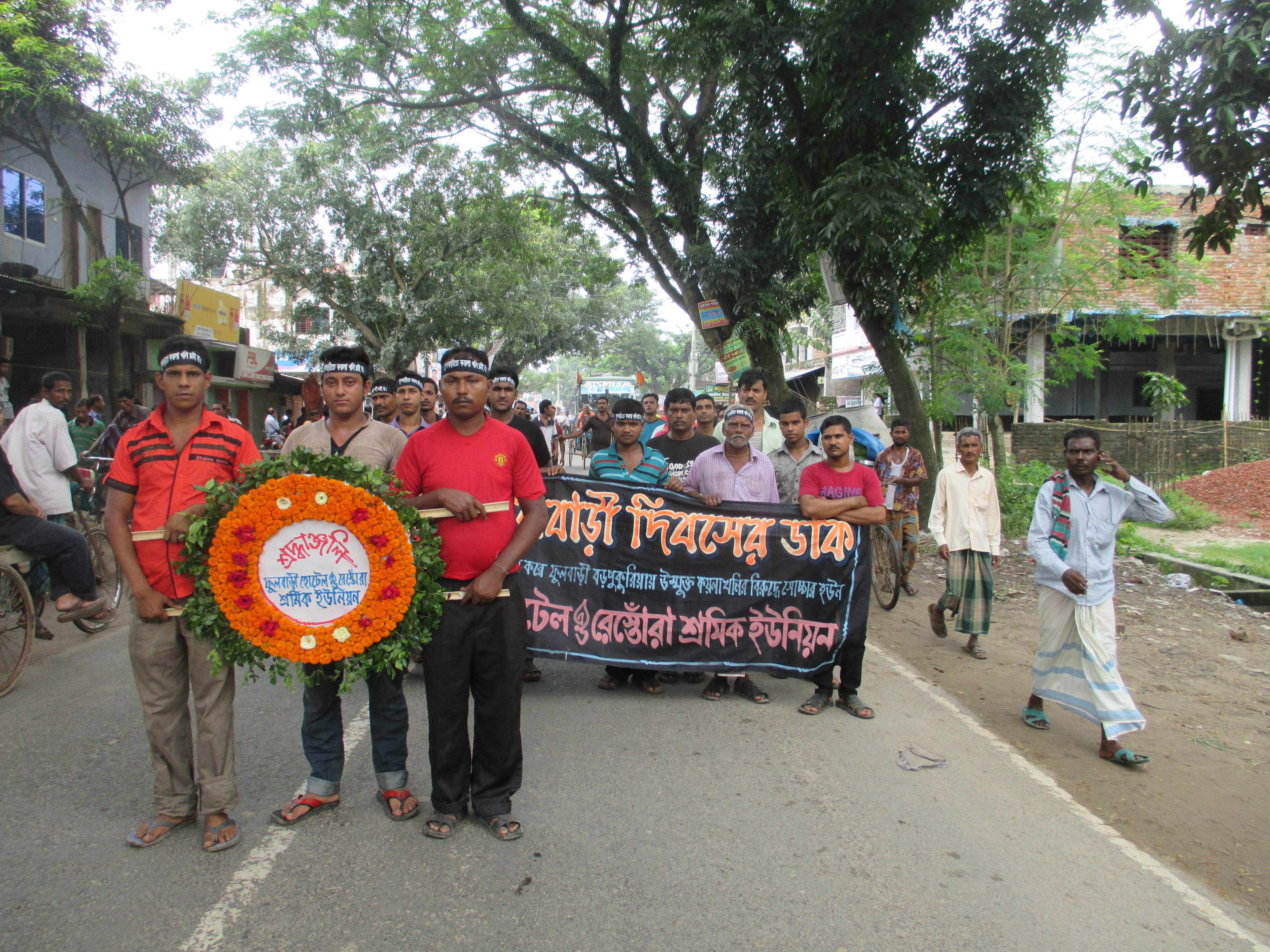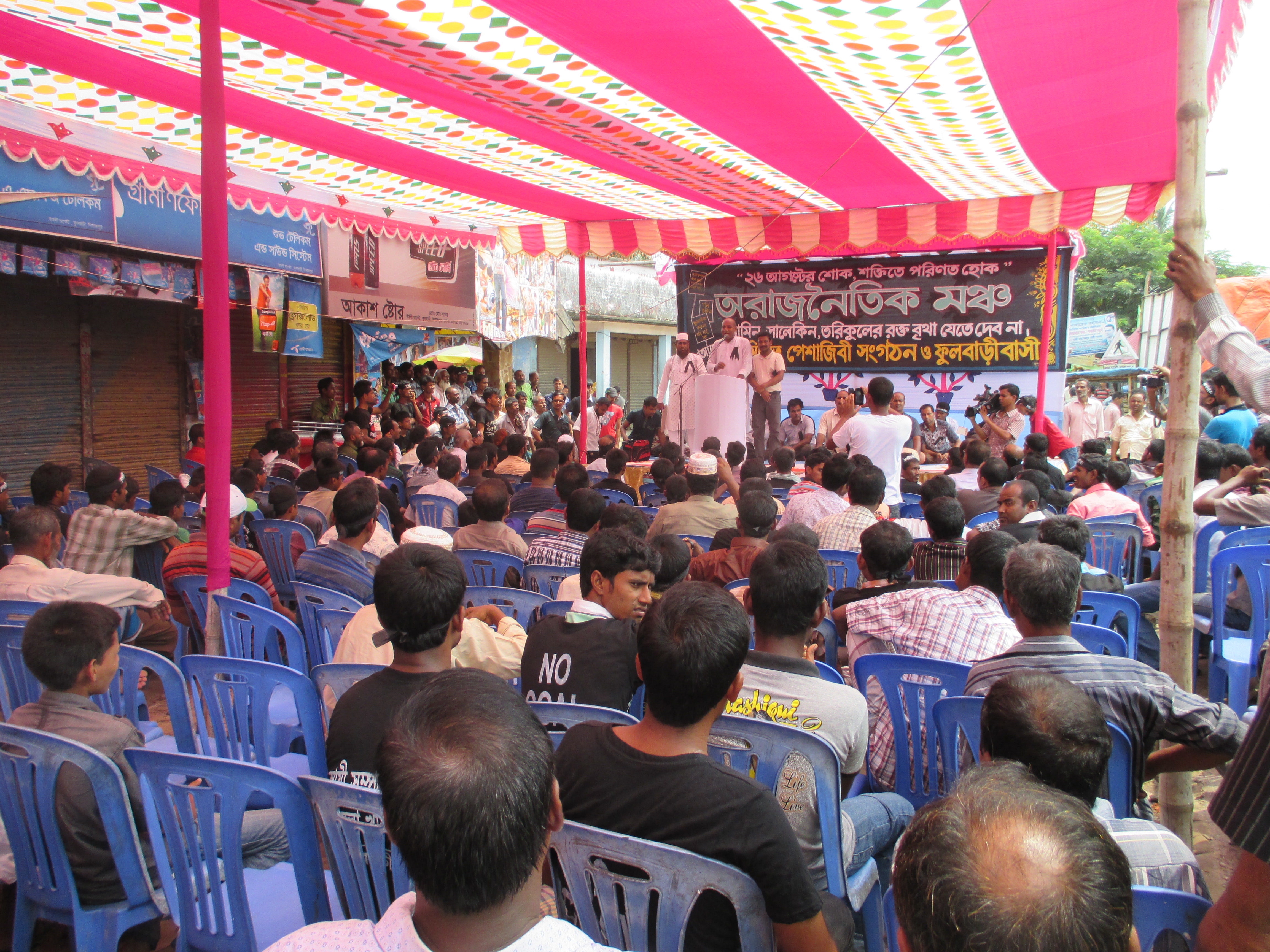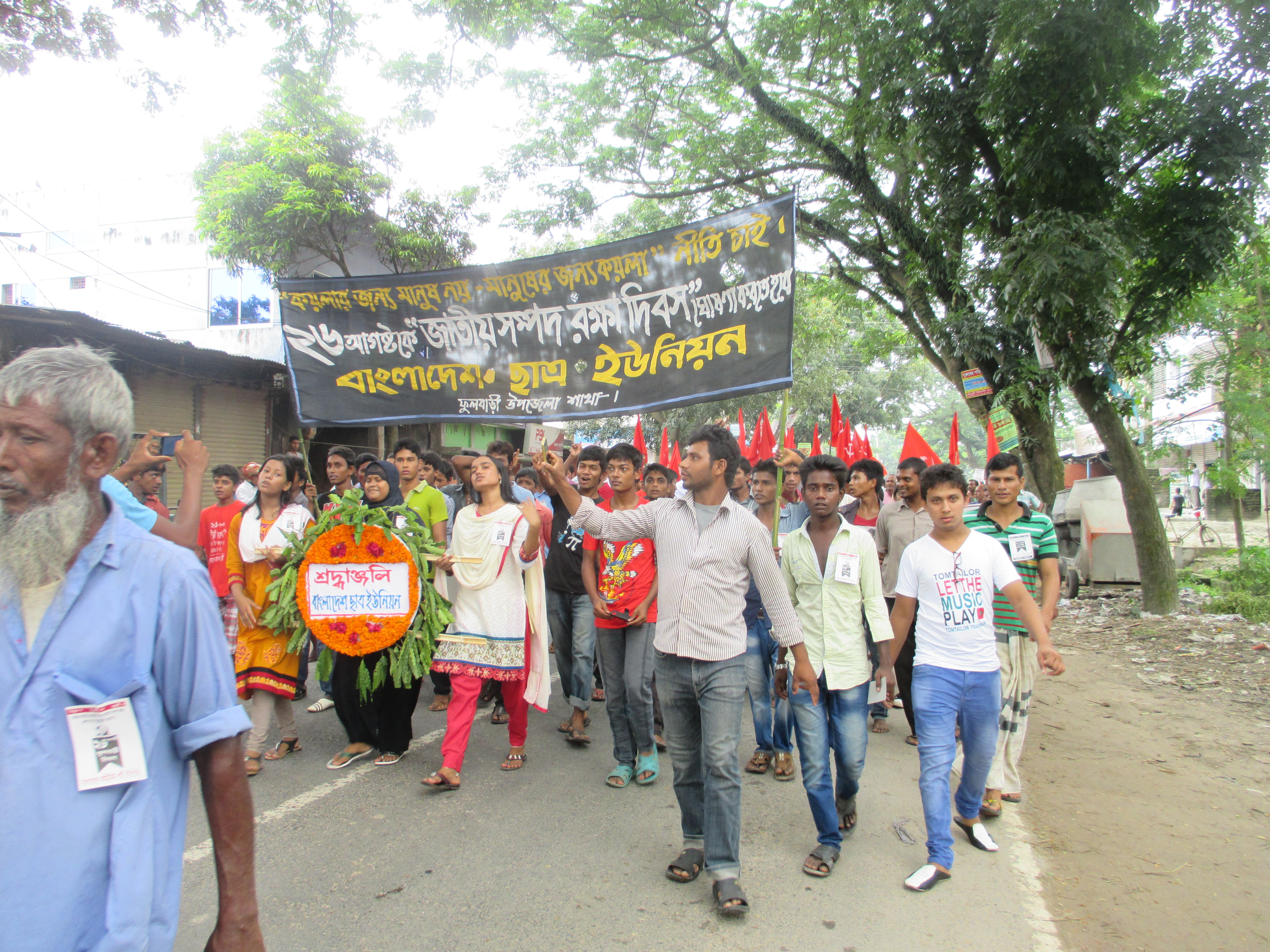On 26 August early in the morning people in Phulbari, including children, are getting ready by wearing black badges on their chest to join a condolence procession and march to the martyrs monument to express their love, respect and gratitude to the sacrificed lives, namely Al-Amin, Tariqul and Salekin, three children, aged from 13 to 22, who were shot dead by the Border Guards of Bangladesh Government on 26 August in 2006.The activists of Procheshta Gronthagar, a library initiative of young people in Phulbari, are waiting for the Central National Committee leaders to lead their march to the martyrs monument.The union of construction workers in the rally.While the local inhabitants of Phulbari are busy marching on the streets of their own small town many ‘outsiders’ are taking notes and photos of them. Prominent journalist and feminist poet, short story writer Shameema Binte Rahman is photographing one marchers in my shot while I am busy capturing the slogan on the t-shirt of the marcher. The slogan: “We don’t want the coal mine by destroying permanent (read non-renewable) resources. Inhabitants of Phulbari”Activists of Gonoshanghati Andolon, a leftist political organization, are waiting for their other comrades to show up beside the Dhaka-Dinajpur highway. The banner says: “No open-pit coal mining, No MNOC, No export, Red salute to the martyrs of the movement to protect national resources.”Of course not everybody in Phulbari is in the rally as some of them are busy doing farming or other works. This tractor driver is driving his vehicle to the opposite direction of the monument but is expressing his solidarity with the rally by wearing a t-shirt. The slogan says: “Stand against all conspiracy to establish the destructive open pit coal mine.”Another busy Phulbarian is not joining the rally but expressing his solidarity by wearing a t-shit. His slogan says: “Let the agony of 26 August turn in to strength: the inhabitants of Phulbari”Some local NGO, namely Social and Environment Development Forum, puts fresh poster on the wall asking for planting trees to save the dying world. Perhaps the posters are irrelevant to ‘Phulbari uprising’, perhaps they are not, I wonder, but definitely they do not mention destructive projects by MNOC that actually play important role in destroying society and environment worldwide. The poster depicts a common pattern of ‘NGOised environmentalist activism’ in Bangladesh.The activists of Bangladesh workers party, another leftist party in Bangladesh, with their banner. In the middle of the banner in red the banner says: “The agreement of Khaleda Government, the promise of Hasina Government, we want the full implementation of six demands”Bablu Roy who was shot to the spinal cord on 26 August 2006 by the armed force of the state is leading the rally of Central National Committee on his wheel chair. He had escaped the death once but, now, sadly he is getting old faster. He looks fifty something in his thirties.The Dinajpur Committee of the National Committee in the rally.The Communist Party of Bangladesh in the rally. The woman in white sari, namely Sayema Khatun is a dedicated midwife, social worker and enterpriser in Phulbari.Student organization Bangladesh Chatro Moitree in the rally.Student organization Bangladesh Chatro Union in the rally. Commonly it is known that they are linked with CPB.Biplobi Chatro Moitree, another leftist student organization in the rally. This organization is known as linked with Bangladesh workers party.Another busy man of Phulbari is participating in the rally, but this time it seems that he will be late with his business with the chicken. Perhaps he is returning to his home to cook it, I wonder.The Union of hotel and restaurant workers in the rally. For the past nine years this organization have played an important role in implementing the ‘all shop closure’ programme of protest on the 26 August.Bangladesh Socialist Party in the rally.Cultural activist group Shangskritir Naya Shetu is waiting to join the rally.All the shops are closed in Phulbari today except this tea stall that saves me from the heat and humid of Vadra by serving a hot raw tea. A banker (state owned) pays for my tea while informing me that he is not joining the rally but officially they are closed for the half day today.The largest demonstration in the rally is composed by the daily labourers and agricultural labourers of Phulbari. The name of their political party is Gono Front that unites workers federation and krishok khetmojur samity (Farmer-agricultural labourers Federation). Unlike the other leftist political parties they put a slogan on the top that call not only the workers to unite but also the ethnic minorities against the open pit coal mining.A santal man plays his dhol in the rally.“We are not nri-gushti (a derogatory term recently introduced by the Bangladesh government for the ethnic minorities) we are adibashi (a preferable term for indigenous people).” This group of ‘ethnic minorities’ holds a banner that says: âDisplacement of adibashi from the mining vicinity will not be toleratedâ. They are organized under Adibashi-Bengali mukti shongram committee.The union of rickshaw (tri-cycle) and van (man-pulled) drivers in the rally.The mayor of Phulbari and a political activist of Bangladesh Awami League organizes a separate rally and public meeting to mark the Phulbari uprising and to pay tribute to the martyrs of 26 August 2006. Considering the âleftistsâ as political his platform is named as ânon-politicalâ. Part of his statement in the public meeting: âI would like to say to the DGFI, SB and other detective branches of the government that no one in Phulbari supports the open-pit coal mining in their vicinity.âThe condolence procession has come to an end at the martyrs monument beside the river Choto Jamuna. The family members and neighbours of martyr Salekin is waiting in the cue to put their flower bu