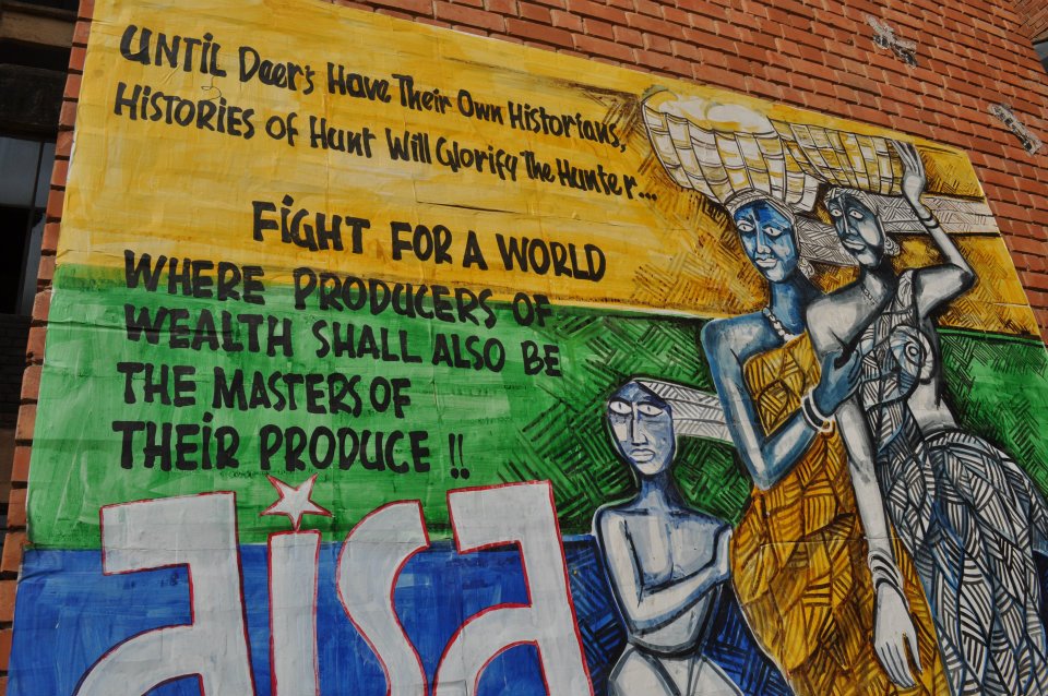 “Fight for a world where producers of wealth shall also be the masters of their produce!” Image of a public art at Jawaharlal Nehru University (JNU) campus, Delhi, 2012.