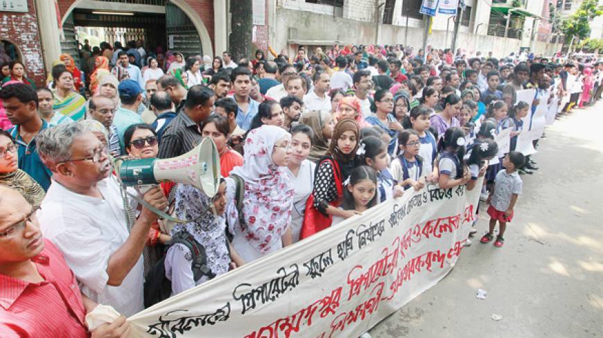 আমি অভিভাবকদের সাথে কথা বলতে শুরু করলাম তাঁদের কথা জানতে। স্কুলের সামনে আমাদের সাবেক, বর্তমান ছাত্রী এবং অভিভাবকদের মনব বন্ধনের প্রস্তুতি চলছে। একজন অভিভাবক আমাকে বললেন অভিযুক্ত গোপাল (সুইপার) বর্তমান কর্তৃপক্ষের অনেক দুর্নীতির সাক্ষী তাই তার বিরুদ্ধে কোন ব্যবস্থা নেয়া হচ্ছেনা। তাকে শাস্তি দিলে কর্তৃপক্ষের অনেক খবর ফাঁস হয়ে যাবে যেটা তারা চাননা, এসব কথাতো আমরা সামনে গিয়ে বলতে পারিনা তোমরা সাবেক ছাত্রী তোমরাই সামনে গিয়ে বল। আমি কিছু বলার আগেই ব্যানারের পেছনে দাঁড়ানো লিটন নন্দীকে প্রায় ঠেলে সরিয়ে আন্টি আমাকে দাঁড় করিয়ে বললেন তার কথাগুলো বলতে।