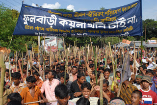 The Phulbari coal project plans to extract coal using open-pit mining method in seven unions and one municipality in four upazilas of Phulbari, Birampur, Nawabganj and Parbatipur in Dinajpur district. The company behind the $1.4-billion project is Asia Energy Corporation (Bangladesh), a wholly-owned subsidiary of the British-registered Global Coal Management Resources Pls. According to Asia Energy, 40,000 people would be involuntarily resettled, 10,000 hectares, primarily of fertile agricultural land, would be required for mine and associated infrastructure. Activists say the number of people evicted is likely to be ten times more. The proposed coal project would divert a river, suck an aquifer dry for thirty years, the life span of the project. Dynamite explosion, environmentalists say, would cause noise and dust pollution, this would be increased by the trucks and trains that will haul away the coal to the port in Sundarban. To prevent flooding, huge pumps will pump out 800 million litres of water daily, from the mine. This will lower the groundwater in an area covering 500 square kilometres. Air and water pollution is likely to spread to surrounding water bodies. Asia Energy plans to create a huge lake after the project is over, but activists predict that the water is likely to be toxic.