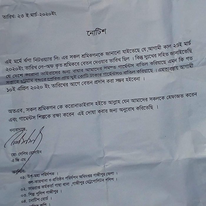 রুবানা হকের কথায় মনে হচ্ছে বিদেশের বায়াররা তাদের অর্ডার বহাল রাখলেই গার্মেন্ট শ্রমিকদের বেতন দেয়া, ছু্টি দেয়া ইত্যাদি সিদ্ধান্ত গার্মেন্ট মালিকরা নিতে পারবেন। কেন? শুনেছি বিভিন্ন শিল্প মালিক সমিতি সহ বিজিএমইএ’ও সরকারের কাছে আর্থিক সহায়তা চেয়েছে। তাহলে শ্রমিকের সবেতনে ছুটি দেয়ার বিষয়টি বায়ারদের টাকা দেয়ার ওপর ছেড়ে দেয়া হচ্ছে কেন?