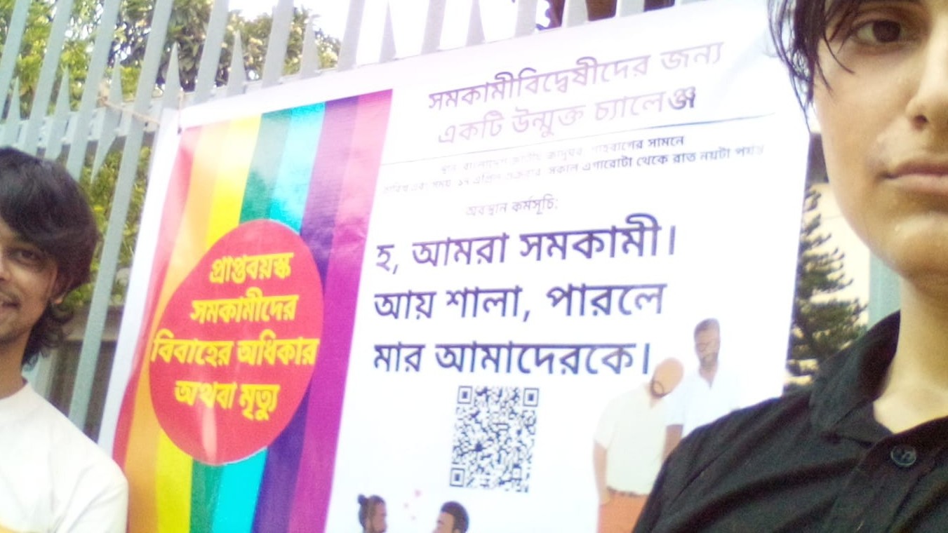 সাহারা: আমাদের আজকের যে ঘটনাটা ঘটলো, যেখানে পুলিশ আমাদেরকে আমাদের গণতান্ত্রিক অধিকার চর্চা করতে দিতেছে না। ১৪৪ ধারা জারি করা হয়েছে, তারা আমাদেরকে সরে যেতে বলতেছে, এইটাই আমাদের গণতান্ত্রিক অধিকার লঙ্ঘনের একটা ব্যাপার। ধরেন যদি, বিএনপি এইখানে আজকে একটা কর্মসূচি করতো, তাহলে জামাত এসে যদি বলতো বিএনপির উপর তাদের অ্যাটাক হবে তাহলে কিন্তু পুলিশ এসে বিএনপিকে বলতো না যে, “আপনারা এখান থেকে চলে যান, ১৪৪ ধারা জারি করা হয়েছে।” তখন বিএনপি বলতো যে “জামাত এইখানে সন্ত্রাসী কাজ করেছে, জামাতকে গিয়ে আটকে দিন।” কিন্তু আমরা, আমাদেরকে পুলিশ একদিকে বলতেছে এইটা (“হ, আমরা সমকামী, আয় শালা পারলে মার আমাদেরকে”) একটা রাজনৈতিক ব্যানার, রাজনৈতিক ব্যানার যদি দাড় করাতে চান তবে পুলিশের কাছ থেকে অনুমোদন নিতে হবে, আবার অন্যদিকে বলতেছে “বিএনপি একটা রাজনৈতিক দল, আপনারা কোনো রাজনৈতিক দল না।” সুতরাং আমরা একটা Schrodinger’s Political Party-র অবস্থানে আছি। তাদের সুবিধা হইলে আমরা রাজনৈতিক কিছু না, তাদের সুবিধা হইলে আমরা রাজনৈতিক। তো এইরকমের ফাইজলামি কইরা পুলিশ আমাদেরকে আমাদের গণতান্ত্রিক অধিকার চর্চা করতে দিতেছে না। গত সপ্তাহে মব যখন তৈরি হইছিলো, তখন মব বলছিলো যে তারা নিজেদের হাতে শাহবাগ থেকে সমকামী দূর করবে। এখন আজকে যেহেতু আমরা সাহস নিয়ে কোনো দ্বিধা ছাড়া আমাদের জায়গাতে দাড়িয়েছি তখন তারা ভীতু কাপুরুষের মতো, paper tigerএর মতো পুলিশের কাছে গিয়ে অভিযোগ করতেছে। পুলিশের কাছে গিয়ে ঠ্যাং ধরতেছে।